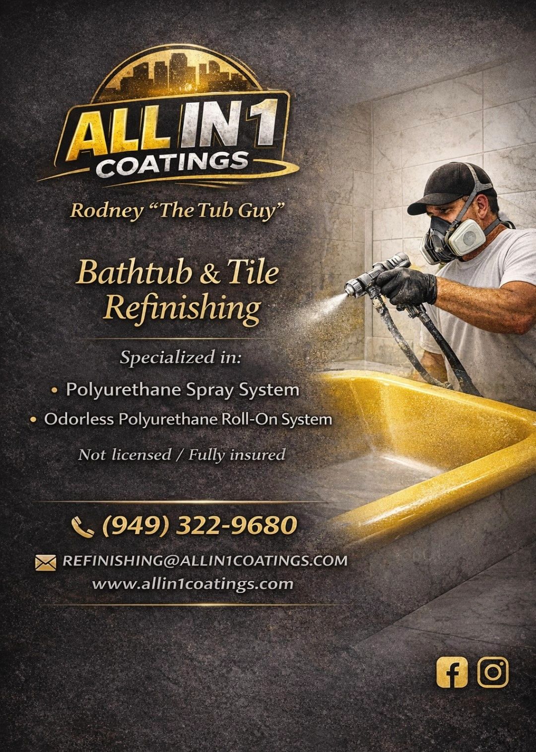 Operating 6-7 days a week from 9am to 9pm, All in 1 coatings RODNEY THE TUB GUY Tub -invites you to call for a quote and time estimate at (949) 332-9680. We specialize in all refinishing, making us your one-stop solution for all your refinishing needs.